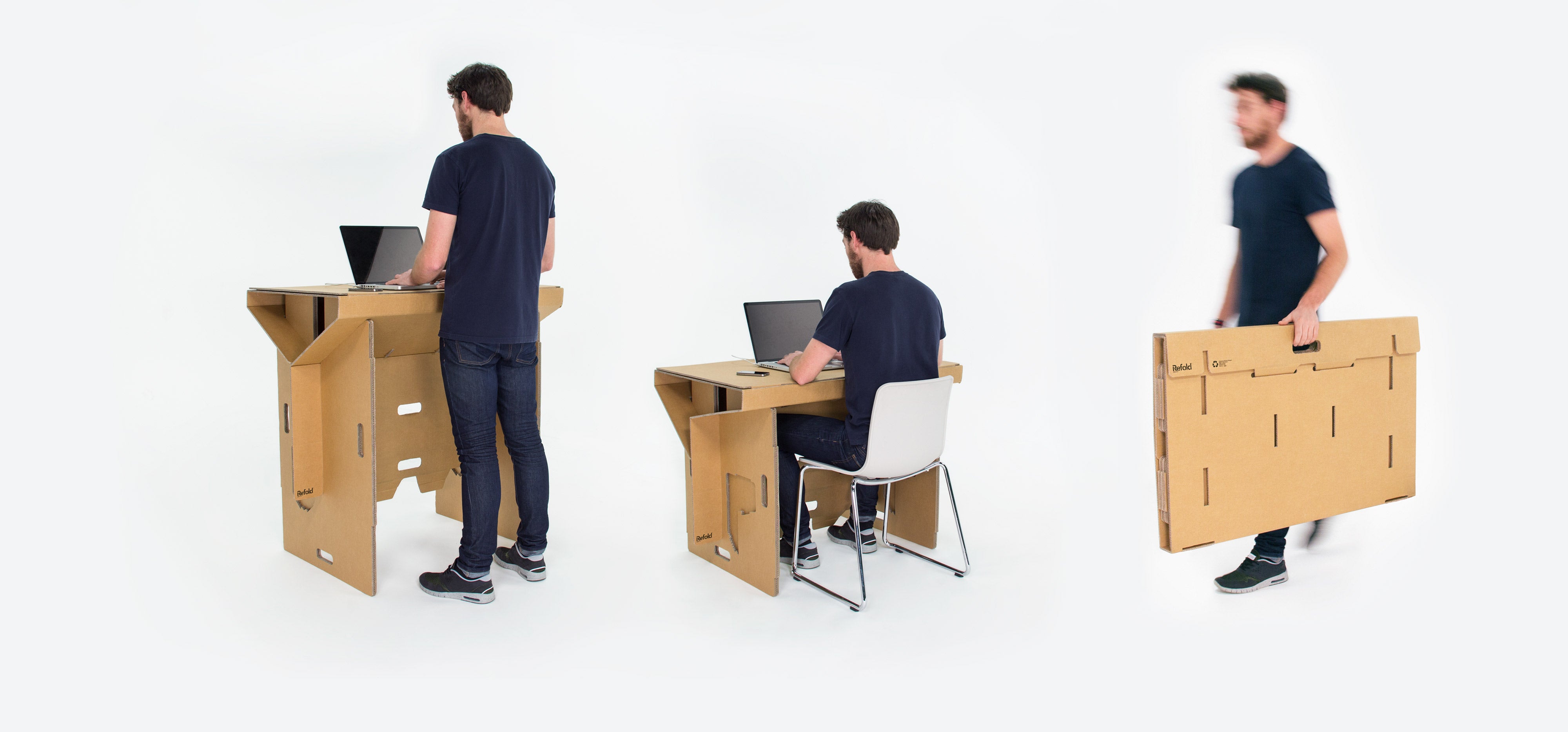 Designed with durable, triple weaved, cross panelled cardboard – our Refold desk is greater than the sum of its parts. The design can easily support your laptop, monitor screen and a 25kg paper weight. Jokes aside, our desks are made with the Rolls Royce of cardboard and can hold up to 60kg without breaking a sweat.